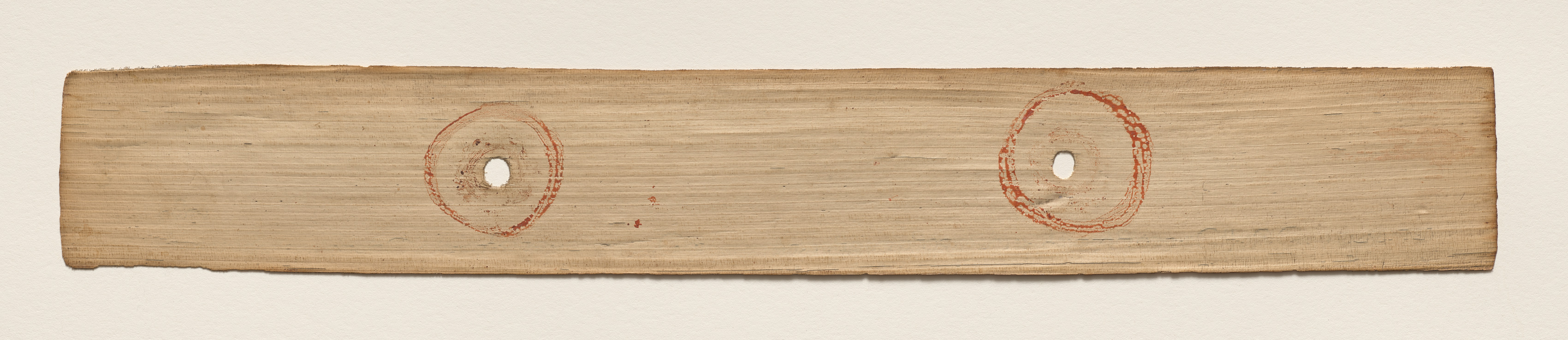 Rectangular piece of light brown material with a rough texture, likely paper or parchment. Two oval shapes are drawn with red ink, one on the left and one on the right side. Each oval has a small circular hole in the center. The edges of the material are rough and uneven. The background is a plain off-white color.