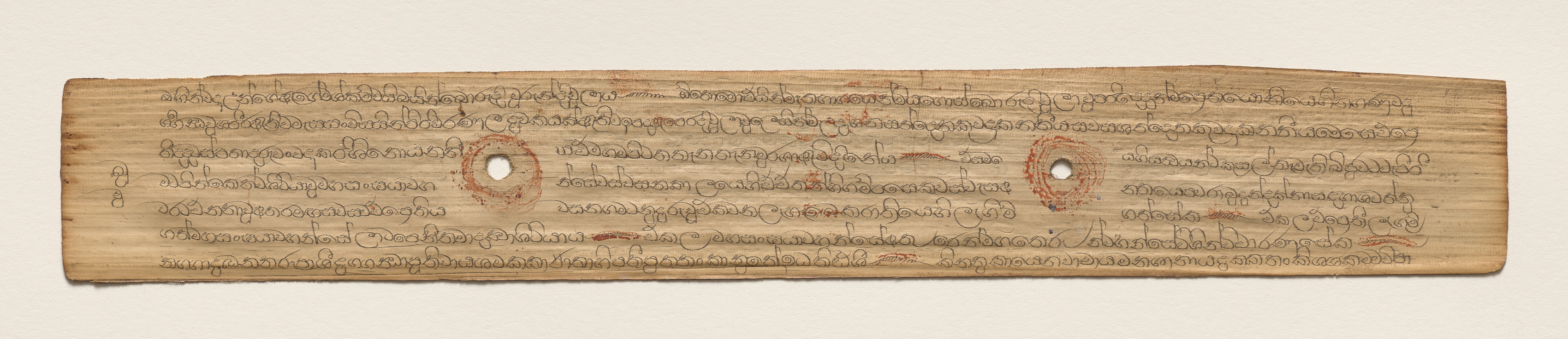 Rectangular piece of light-brown wood with rounded edges. The wood has two circular holes with reddish-brown marks around them. The surface of the wood contains lines of small, dark-brown script written in a flowing style. The lines of script are organized into multiple horizontal rows. The background behind the wood is light gray. The title of the image is "Leaf from a Buddhist Manuscript (recto)" and it is by an unspecified artist.