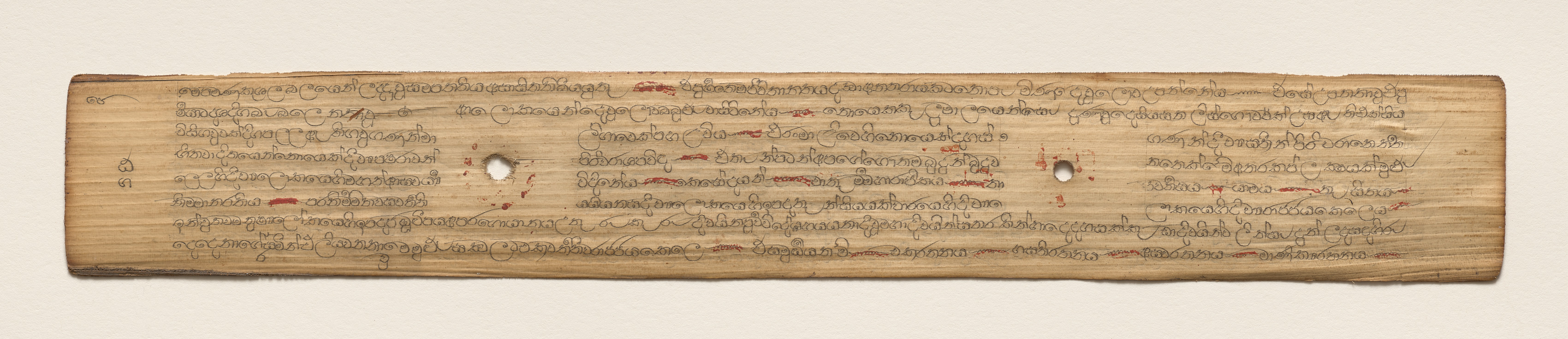 Rectangular piece of light-brown material, likely a leaf, with darker brown edges. The surface features black writing in a script that appears to be handwritten, with several lines of text. Three holes are present, two smaller ones and one slightly larger, positioned horizontally across the leaf. Small red marks are scattered throughout the text. The background of the image is a solid beige color. The artwork is titled "Leaf from a Buddhist Manuscript (recto)" and is by an unknown artist.