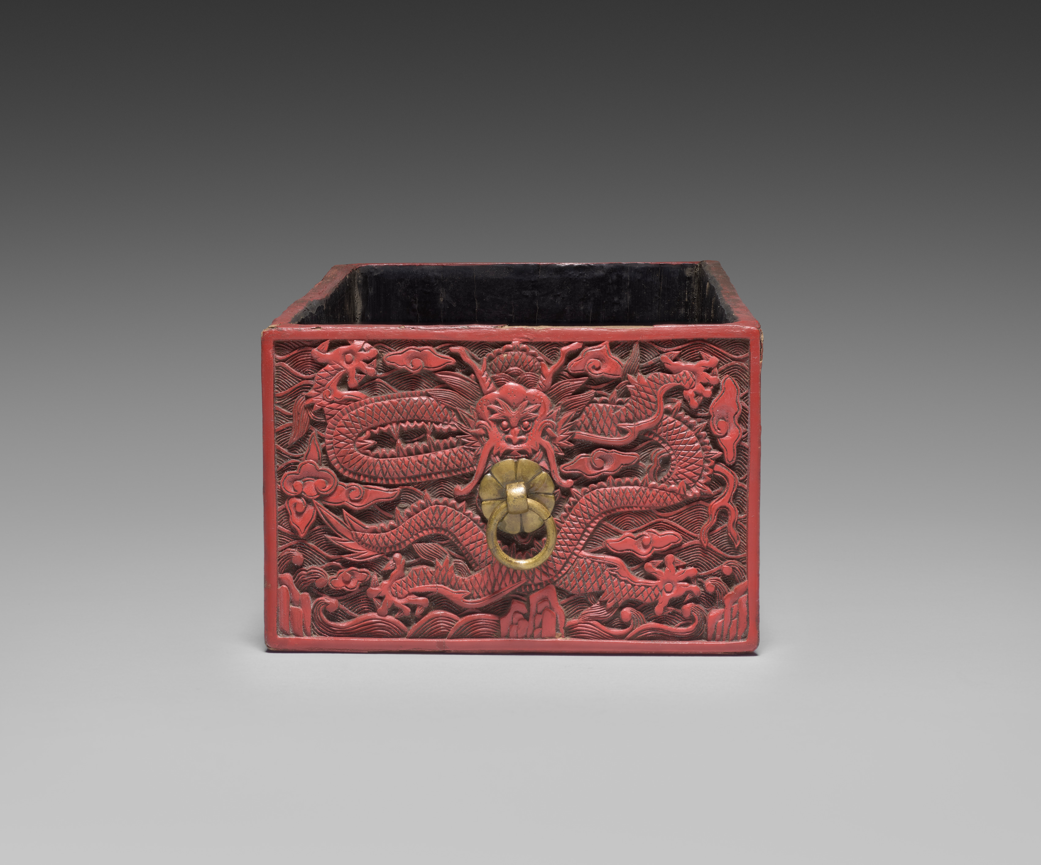 Red, rectangular box with an open top and a gold-colored knob on the front; the exterior is carved with a design featuring dragons and other motifs; the interior is black.