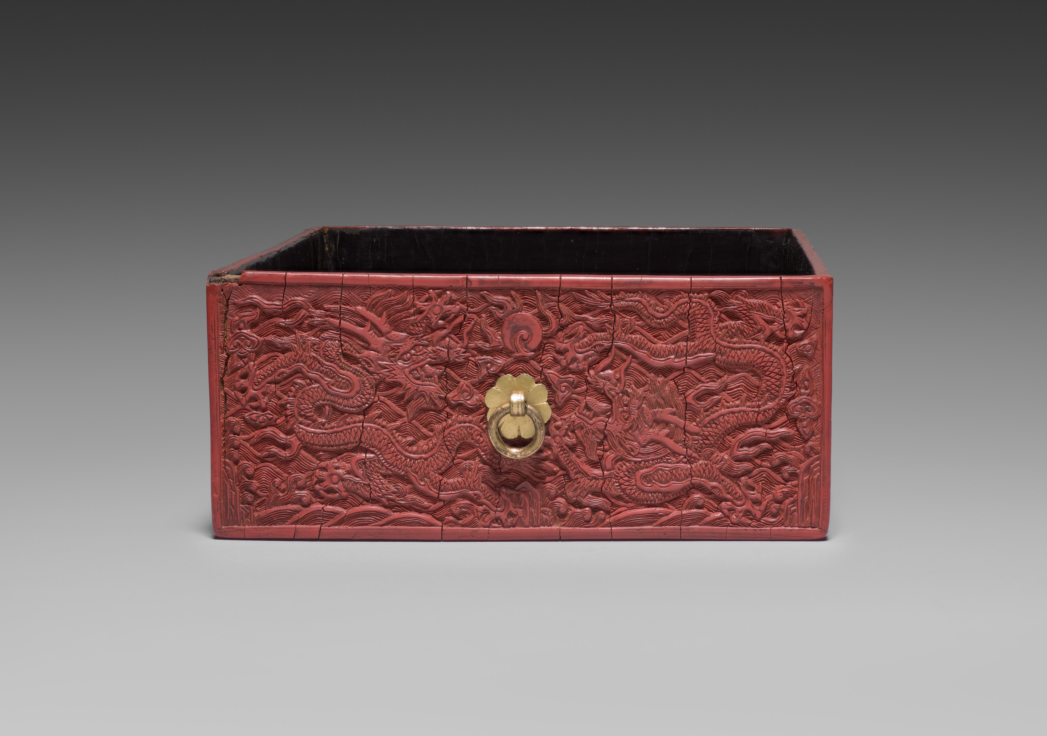 The rectangular box has a red exterior with a raised design featuring dragons and waves. The box has a flat top and straight sides, and the interior appears to be black. A gold-colored handle is centered on the front of the box. Drawer for a Tihong by artist unknown.