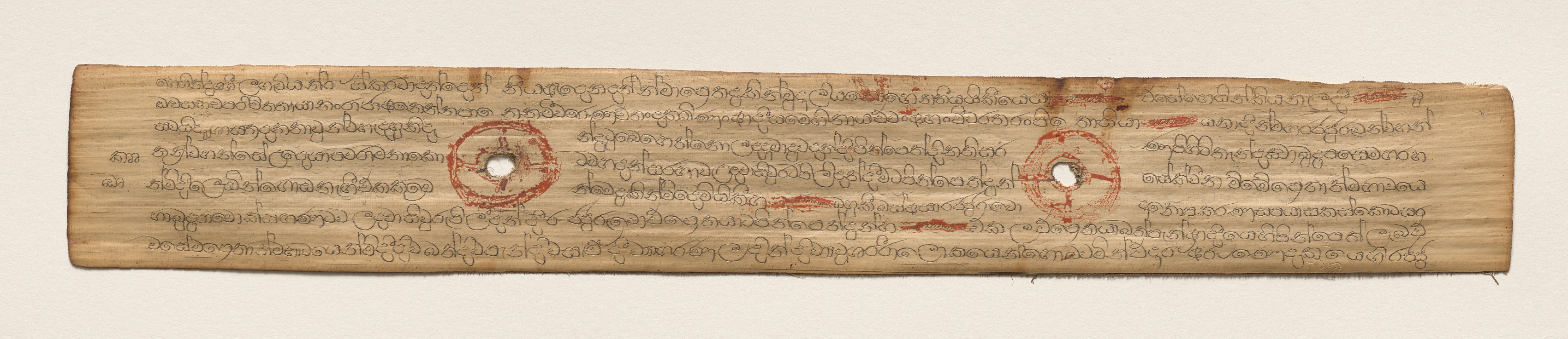 Recto side of a long, narrow, light brown leaf with writing on it. The leaf is rectangular with rounded edges. Two holes are present, one on the left and one on the right, both with red circles around them. The circles are not complete. The leaf has dark writing on it, written in rows, with some red marks. The background is off-white. The artist and title of the leaf are unknown.