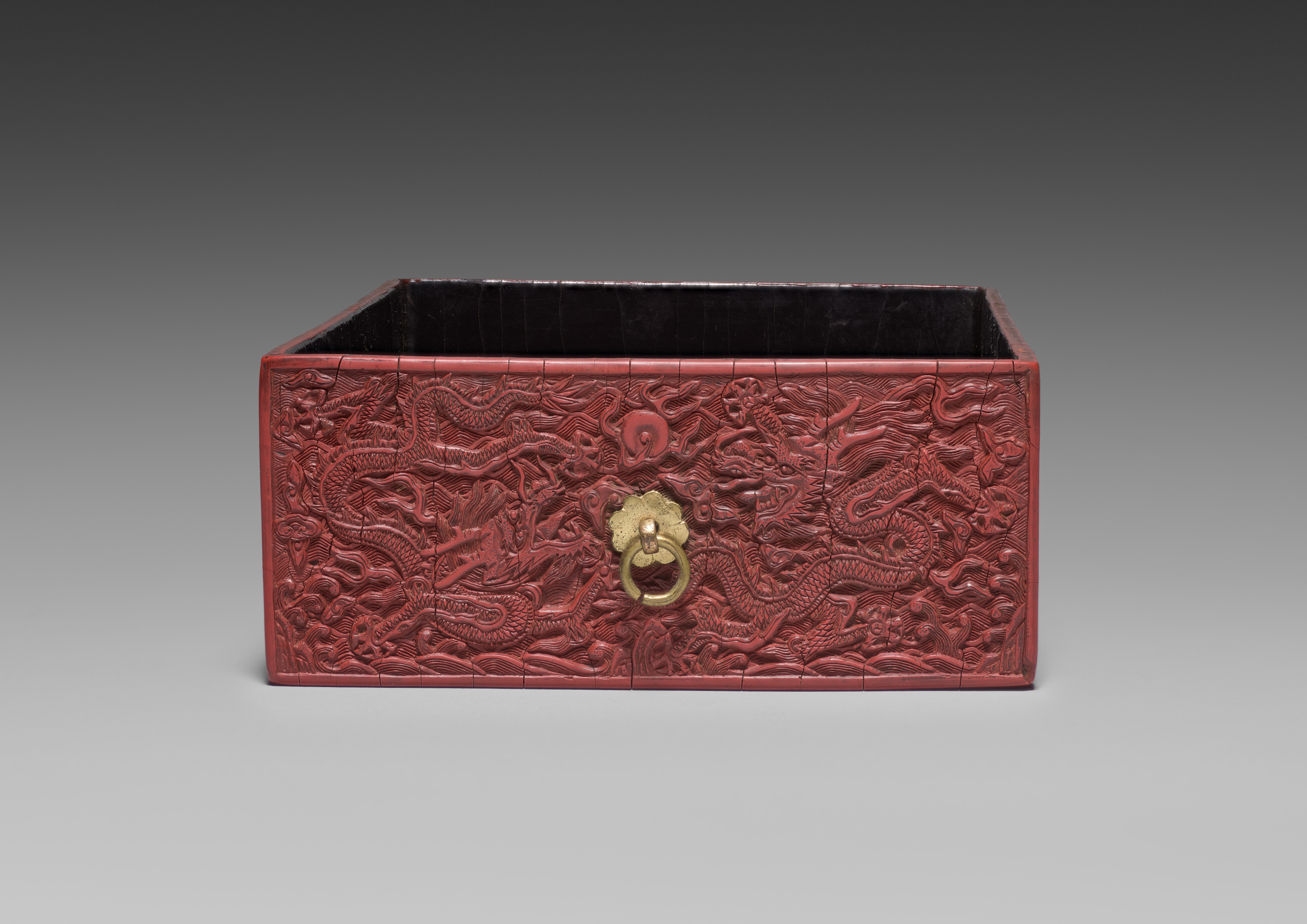 Red rectangular box with a flat top and straight sides; intricate carvings of dragons and waves on the exterior; interior is black; gold-colored ring pull on the front; gradient background from dark to light gray. Drawer for a Tihong, artist unknown.