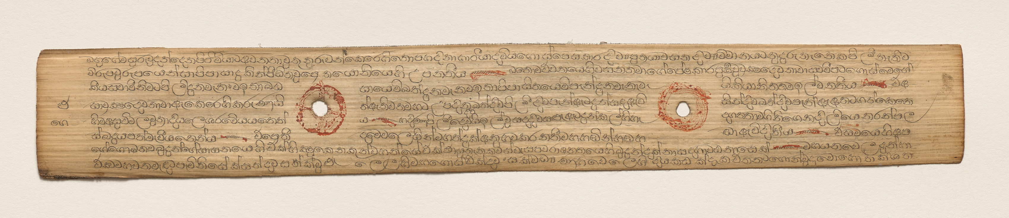 The image shows a long, rectangular, aged, light brown leaf with writing on it. The leaf is oriented horizontally. The leaf has curved ends on the short sides. The leaf has two holes, one on the left side and one on the right side, both roughly one-third of the way down from the top. The holes are circular and have a red circle drawn around them. The leaf has writing on it in black ink. The writing is in rows that follow the long sides of the leaf. The writing appears to be a script. There are red marks on the leaf, possibly corrections or annotations. The background of the image is a solid light beige color. The object is titled "Leaf from a Buddhist Manuscript (recto)" by an unknown artist.