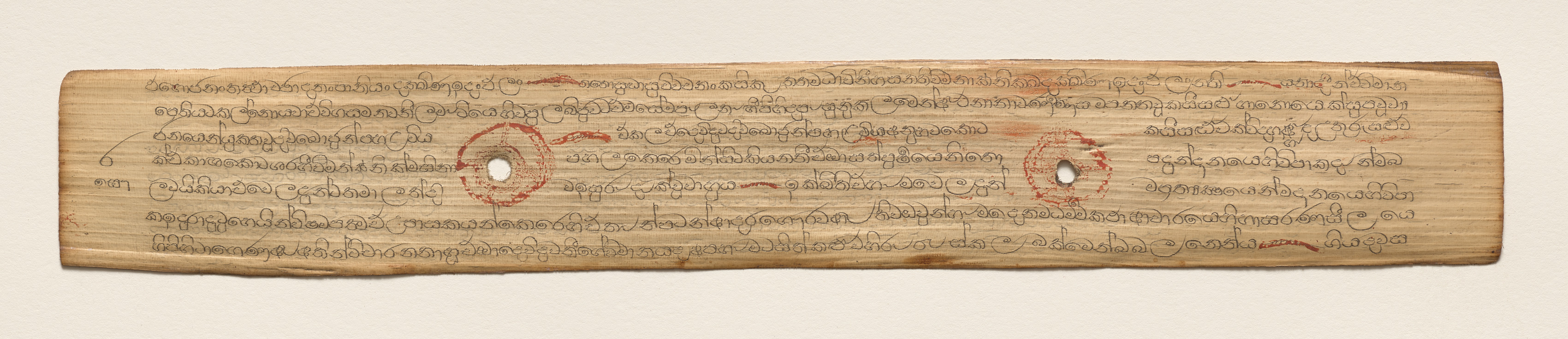Rectangular, aged, light brown leaf with uneven edges. Two holes with red circles around them. Black and red script written in rows. Background color is beige. Title: Leaf from a Buddhist Manuscript (recto), Artist not specified.