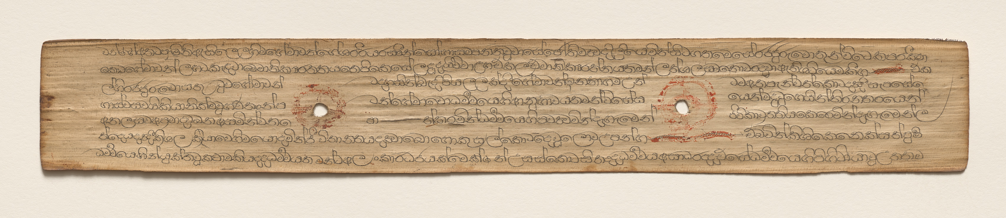 Rectangular, light-brown, aged, wooden object with wavy edges and two holes. The object has writing in a dark color, likely ink, with curved lines and loops. Two rounded, red marks are around the holes. The background of the image is light beige. The orientation is horizontal.