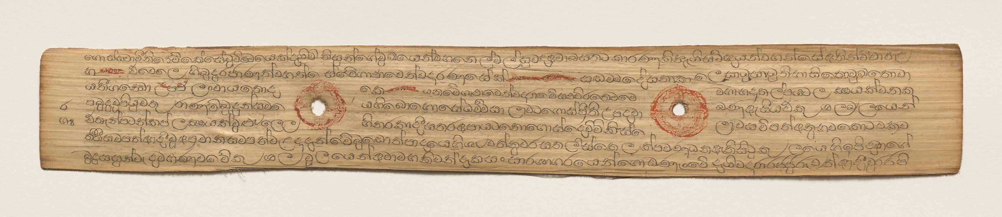 Recto of a long, narrow, light brown leaf with writing on it. The leaf is roughly rectangular with rounded edges and has a slightly darker brown color on the left and right sides. Two circular holes are present, one on the left side and one on the right side, each surrounded by a red circle. The leaf contains rows of black writing in a non-Latin script. The background of the image is beige. The artwork is by an unknown artist and is titled "Leaf from a Buddhist Manuscript (recto)".