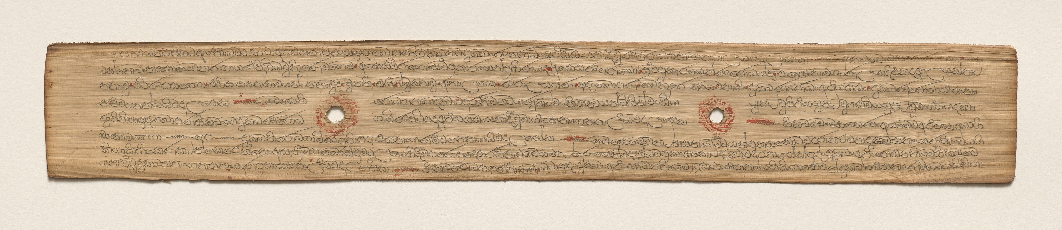 Long, narrow, light brown rectangular piece of material with darker brown edges. The material contains numerous lines of small, dark brown writing. There are two round holes in the center of the material, with rough, reddish-brown areas around them. The background of the image is a light beige color. The text on the material appears to be written in an ancient script. The material seems to be a yellowed, aged piece of paper or parchment. The image displays the back side of the material. The writing on the material is in a language that appears to be from an Eastern culture. The material has a worn and aged appearance. The image presents a historic-looking document or manuscript page.