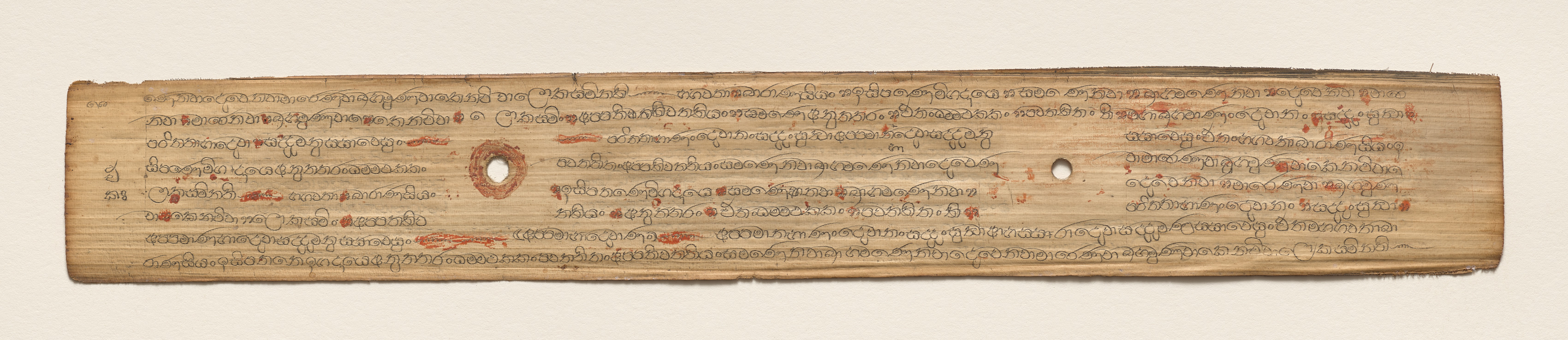 Rectangular, aged, light brown leaf with darker brown edges. Two round holes in center, one larger and to the left of the other. Red and black markings throughout. Black writing in a script with many curved lines. The leaf is long and narrow, with uneven edges. The background behind the leaf is a solid off-white color. The artwork is titled "Leaf from a Buddhist Manuscript (recto)" by an unknown artist.