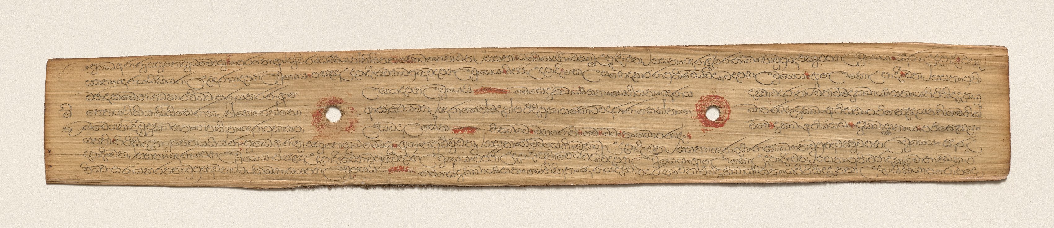 Rectangular, aged, light brown leaf with darker brown edges; long and narrow. Two small circular holes, one on left and one on right side. Red marks around holes and scattered on leaf; black script writing lines cover surface. Title: Leaf from a Buddhist Manuscript (recto) Artist: Unknown.