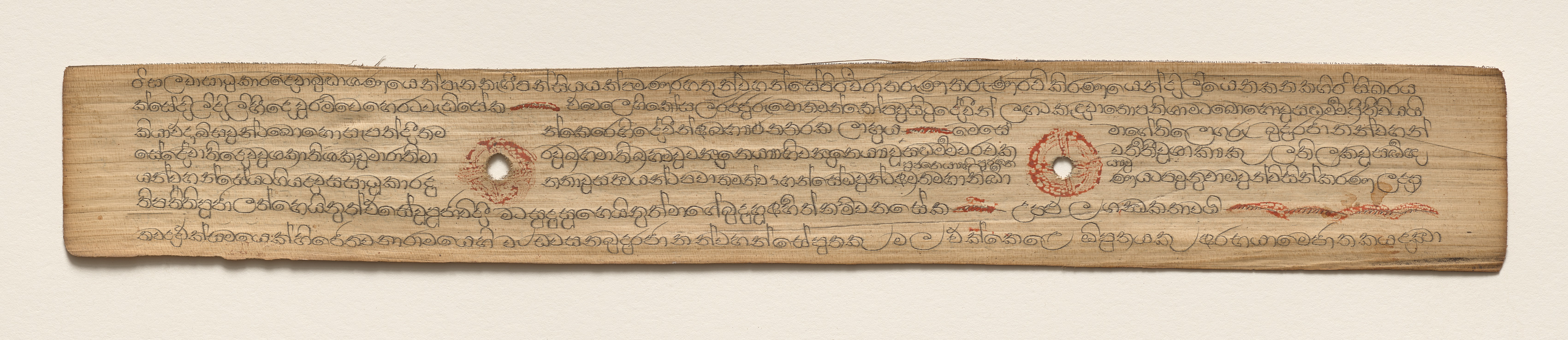 A long, thin, light brown leaf with writing on it. The leaf is rectangular and has rounded edges. There are two holes in the leaf, one on the left side and one on the right side, both with red markings around them. The writing on the leaf is in a curved script and is written in black ink. The writing is arranged in lines that run horizontally across the leaf. There are also some red markings on the leaf, including lines and circles. The background of the image is a plain beige color.