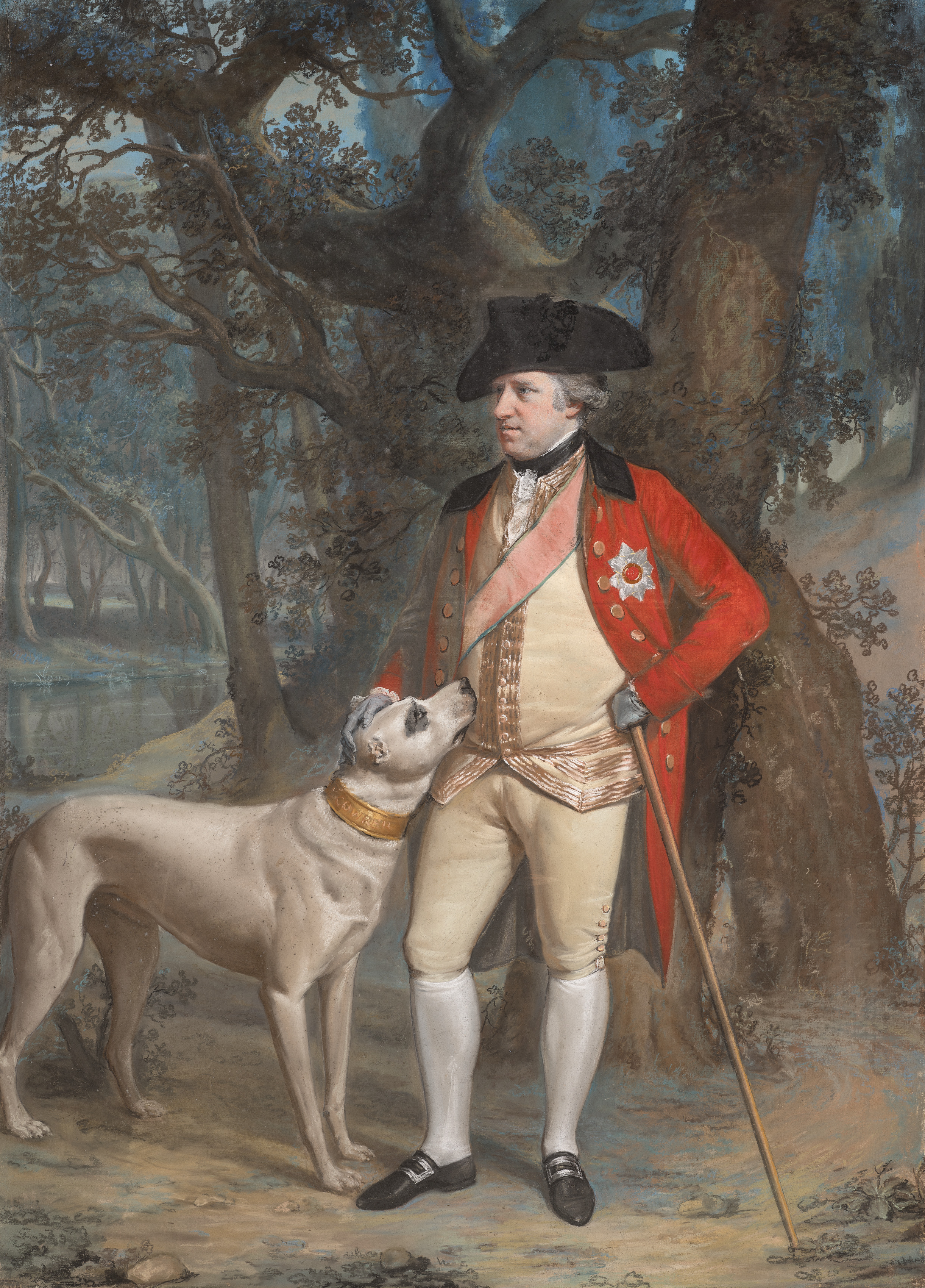 Full-body portrait of a man in 18th-century attire. The man has fair skin and gray hair. He wears a black tricorn hat, a red coat with gold buttons and a pink sash, a beige waistcoat and breeches, white stockings, and black shoes. A white star-shaped decoration is on his left chest. He holds a wooden cane in his right hand. A large white dog with a gold collar stands beside him, looking up. The background features trees, a body of water, and a blue sky.