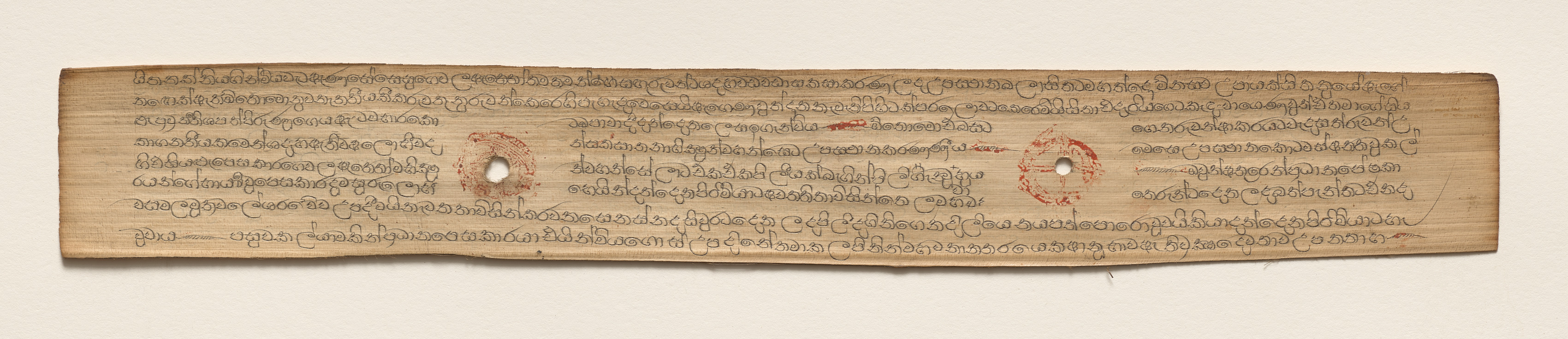 Long, narrow, light-brown leaf with curved edges and wavy lines across the top and bottom. The leaf has two circular holes with red discoloration around them, one on the left and one on the right. The leaf has several rows of small, dark-brown writing on it. The background is plain and off-white. The leaf from a Buddhist Manuscript (verso) by an unknown artist.