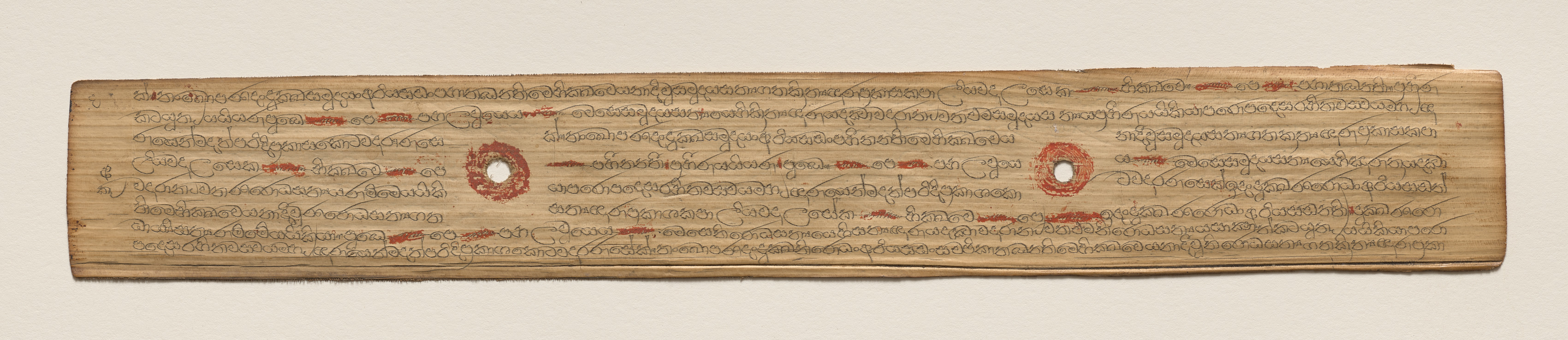 Recto side of a long, narrow, yellowed leaf with writing on it. The leaf is rectangular with rounded edges and has darker areas along its length that could be from age or staining. Two circular holes are present side by side near the center. There are several lines of cursive writing on the leaf in a dark brown color. Some of the writing is faded. Red circular designs surround the holes. The background behind the leaf is plain and light-colored. Artist and title: Buddhist Manuscript leaf.