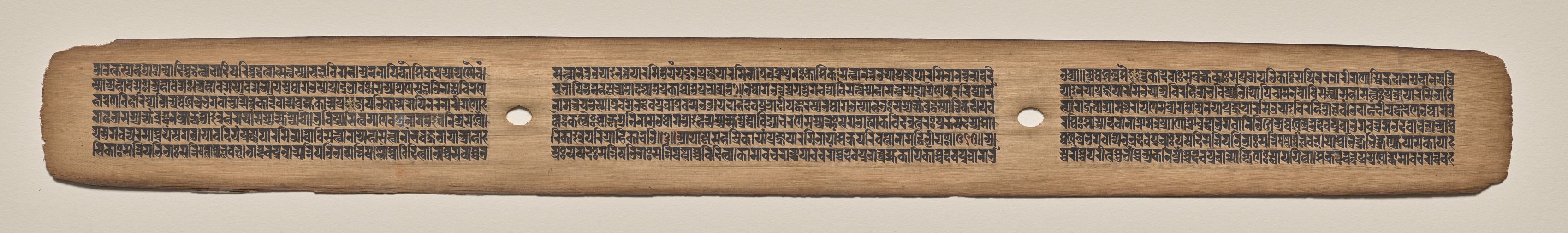 Rectangular, light-brown colored, wooden manuscript page with rounded edges; two circular holes; entire surface covered with rows of black text; text organized into three columns separated by the holes; surface appears worn, edges rough and frayed; background light beige.