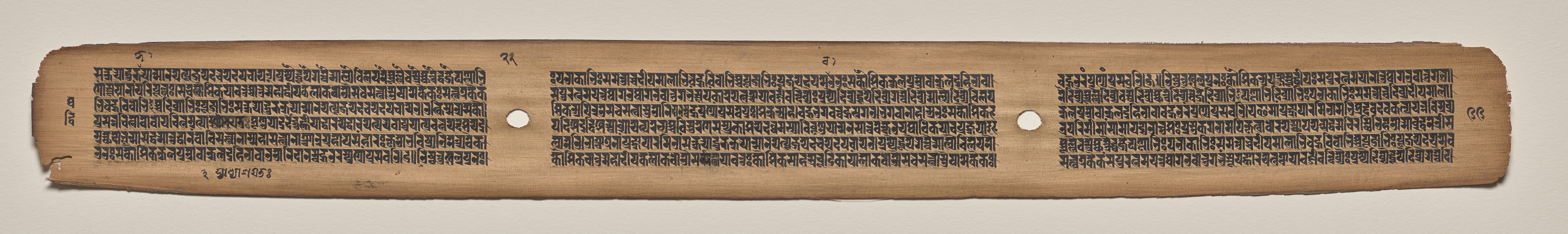 The image shows a long, narrow, rectangular piece of aged paper or parchment with rounded edges. The paper is light brown and has a rough texture. There are three sections of black text written in a foreign language, possibly Sanskrit, arranged in columns. Each column contains multiple lines of text. Two small oval holes are located in the center of the paper, one in the middle section and one slightly to the right. The background of the image is a plain light gray color.