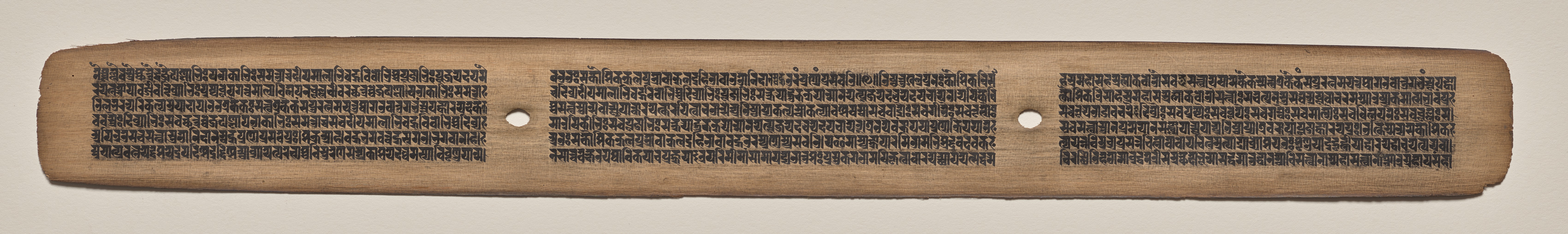 Rectangular piece of wood with rounded short edges and straight long edges. Wooden piece has three sections of text written in black ink. The text sections are separated by two circular holes. The text sections are made up of multiple lines of small characters. The lines of text are horizontal. The background behind the wooden piece is light brown.
