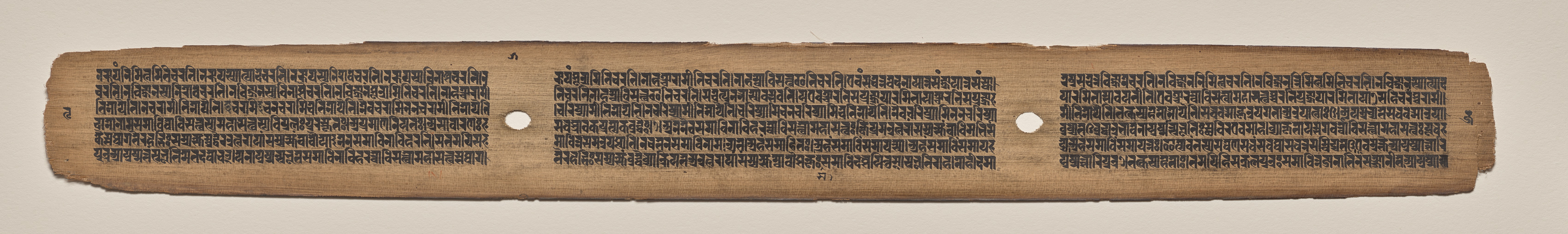 Long, thin, tan-colored manuscript page with rough, uneven edges, featuring three columns of small, black text written in a non-Latin script. The page has two oval holes, one near the center and one to the right, and appears to be made of a material resembling palm leaves or paper. The text is arranged in horizontal lines, with the columns separated by the holes. The background of the image is a plain, off-white color.