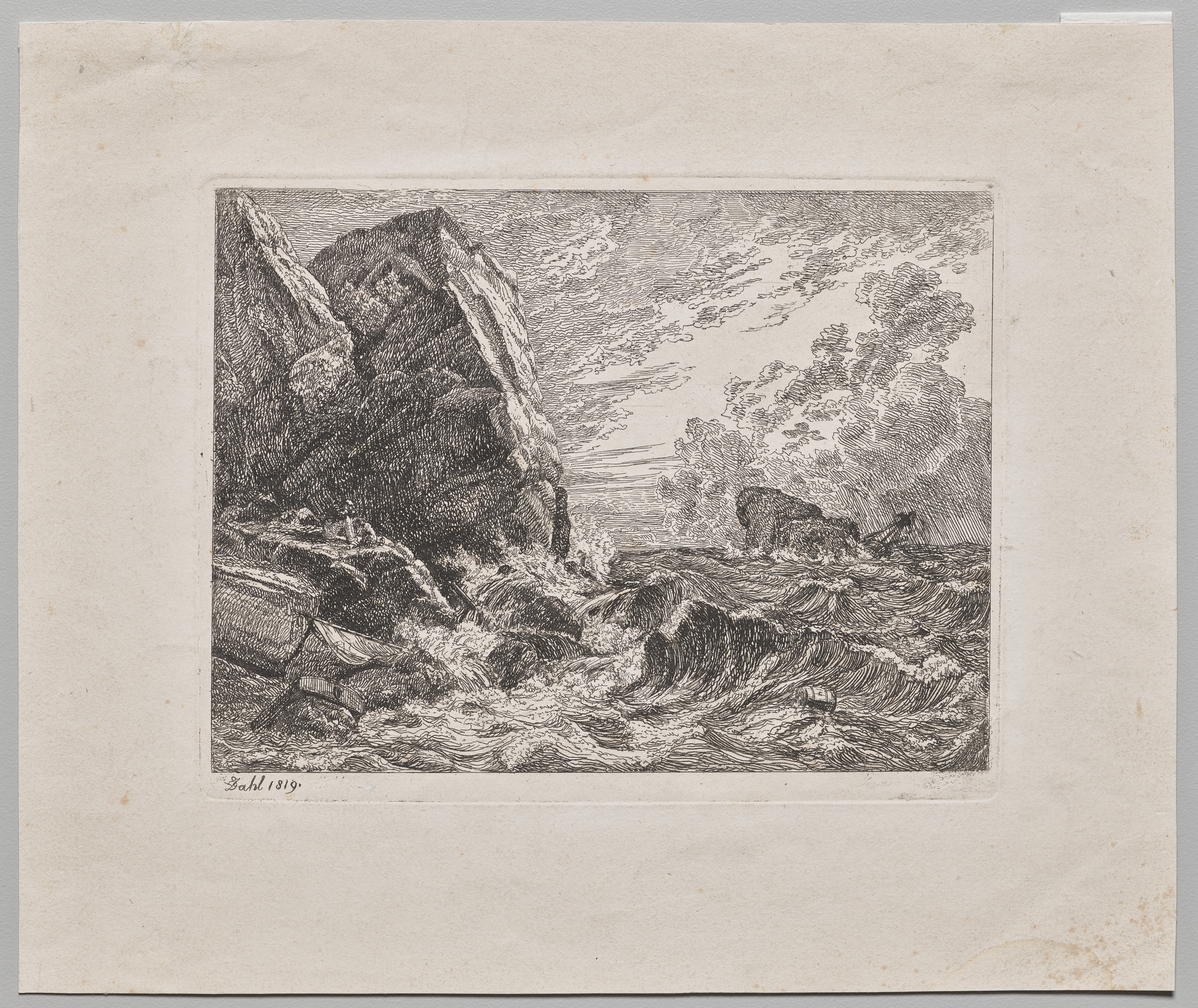 Black and white drawing on aged paper. A rocky cliff on the left side and choppy water below and in the distance. A ship on the water appears to be on the right side. The drawing depicts a stormy scene. The artist's signature and date are in the bottom-left corner. The background of the drawing is a cloudy sky.