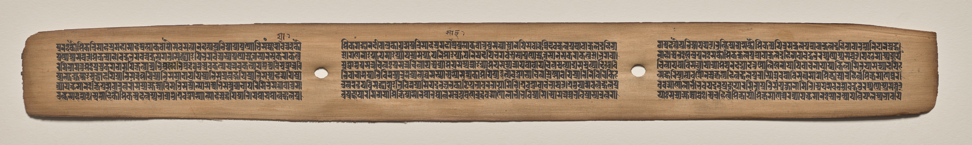 Rectangular, light brown, aged paper or parchment with uneven edges; three columns of small, black, dense text written in a non-Latin script; two circular holes in center; background is beige.