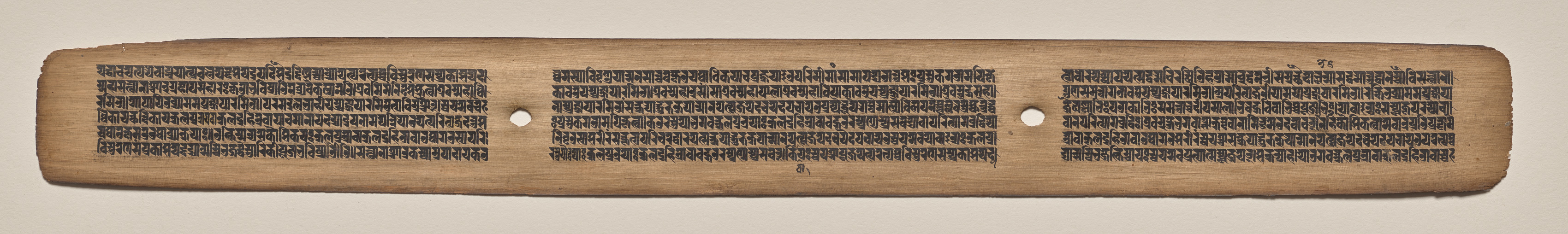 Rectangular, light brown, wooden manuscript page with rounded edges and two holes. The page has a darker edge around it. The text is written in black ink and arranged in three columns. Each column contains numerous lines of text. The holes are circular and positioned one on the left and one on the right, in the middle of the page, The background behind the manuscript page is light gray.