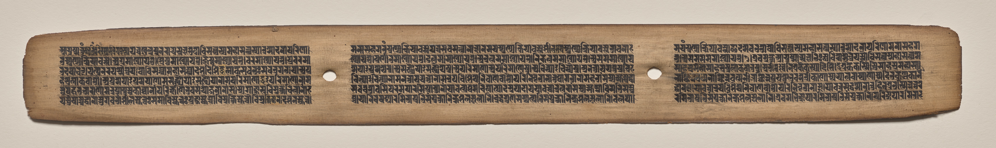 Long, narrow, tan-colored paper or parchment with rounded edges and darker edges; three sections of black text arranged in horizontal rows; two circular holes, one in the center of each of the two middle sections.