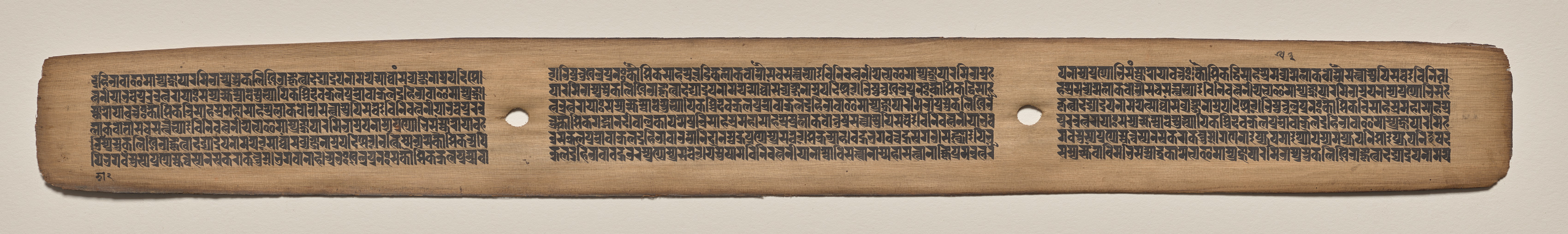 Long, narrow, light brown, wooden panel with rounded short edges. Three sections of black text written in rows. Two round holes centered horizontally, one in each middle third of panel. Text on panel written in a foreign script.