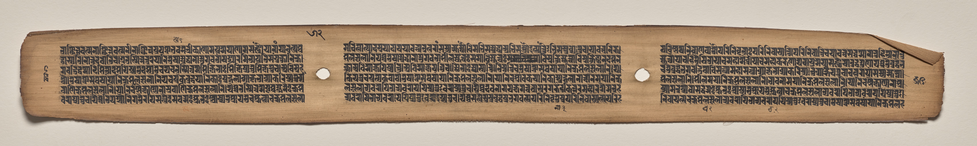 A long, narrow, light-brown piece of parchment with three columns of black text written in a non-Latin script. The parchment is oriented horizontally. The left and right sides are uneven. The top edge is also uneven and has a slight curve. There are two circular holes, one between the first and second columns and one between the second and third columns. The background behind the parchment is light gray.