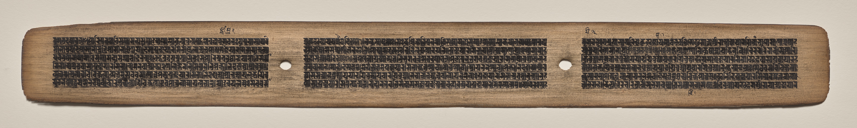 Long, narrow, light brown wooden panel. Three columns of small, dark writing. Two small holes, one between first and second columns, one between second and third. Columns are divided by holes. Text fills most of panel. Background is plain.