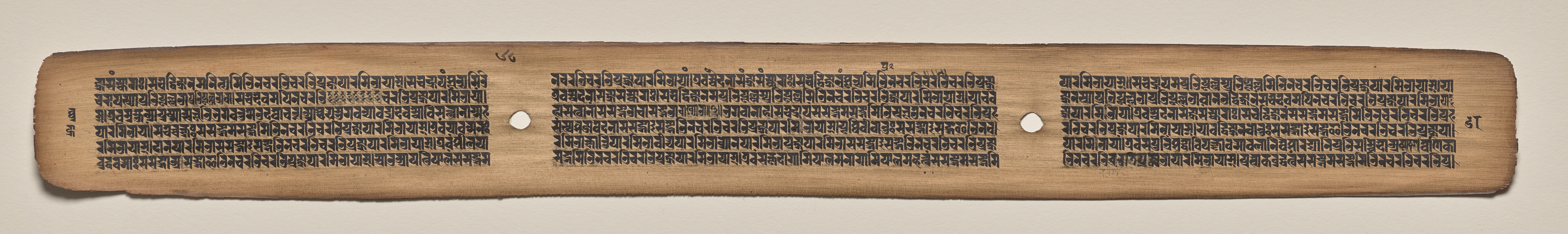 Long, thin, light brown rectangular sheet of paper with wavy edges. Two round holes, one near each end. Three columns of densely written black text. Text written in a small, uniform script. Columns separated by the holes. Text fills most of the page, leaving little margin around the edges. Background behind the paper is a light beige color.