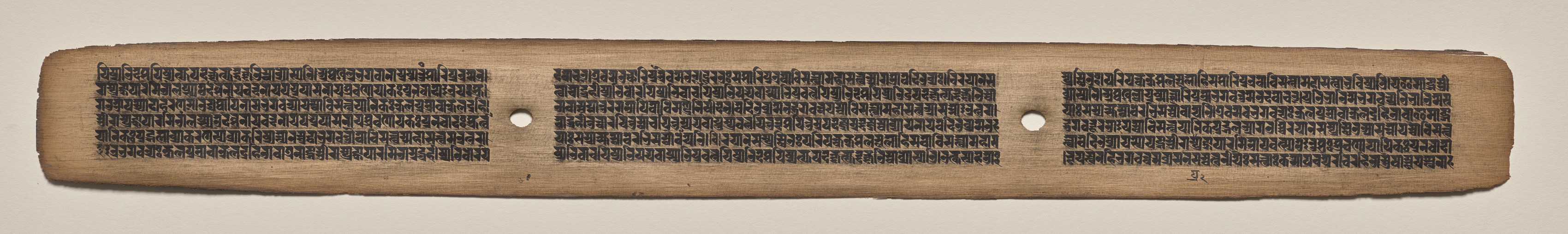 Long, thin, light-brown colored piece of paper or parchment, slightly darker on the edges. The paper is divided into three sections by two small circular holes. Each section contains many lines of small black text. The text fills the entire area of each section. The paper has rough, uneven edges, and a slight curve along its long axis. The background behind the paper is light beige.