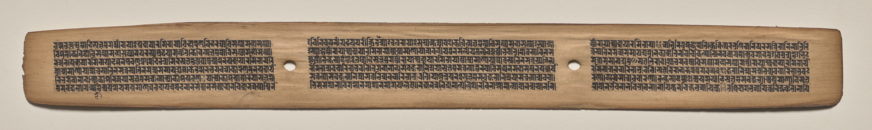 Rectangular, light-brown, wooden manuscript page with black text, featuring three sections of lines of text. Two small holes, one in center of each middle section, likely for binding. Text written in an ancient script. Edges of the page are slightly rough and uneven. Object is oriented horizontally.