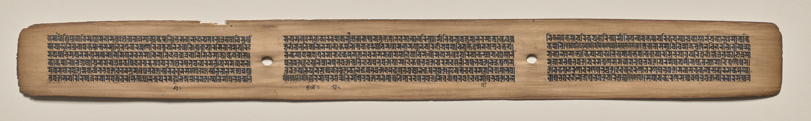 Long, narrow, light-brown colored page with rounded short ends. The page has three sections with a small hole in the center of each section. Each section contains numerous lines of small, dark text. The holes are on either side of the center, one on the left and one on the right. The background behind the page is light-colored and featureless.
