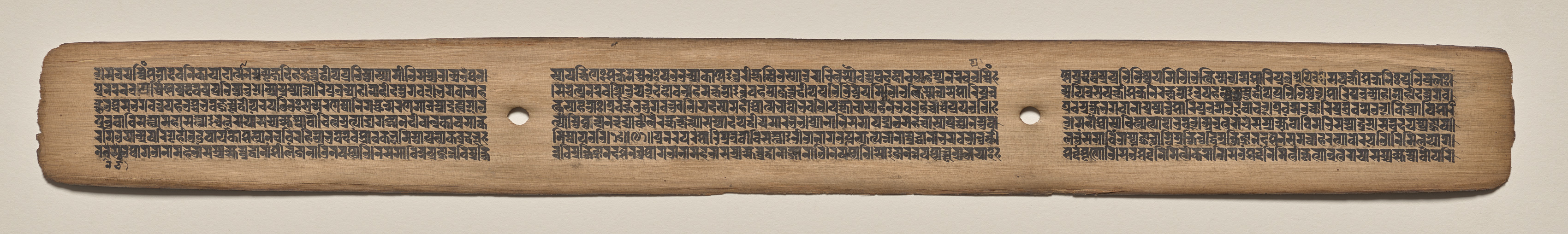 Rectangular, light-brown, possibly aged or weathered, wooden or bamboo folio; approximately three times wider than it is tall. Three sections of evenly spaced, uniform, black, written text divided by two small holes; text arranged in rows. Edges rough and uneven, with left and right sides curving inward. Background a light gray color.