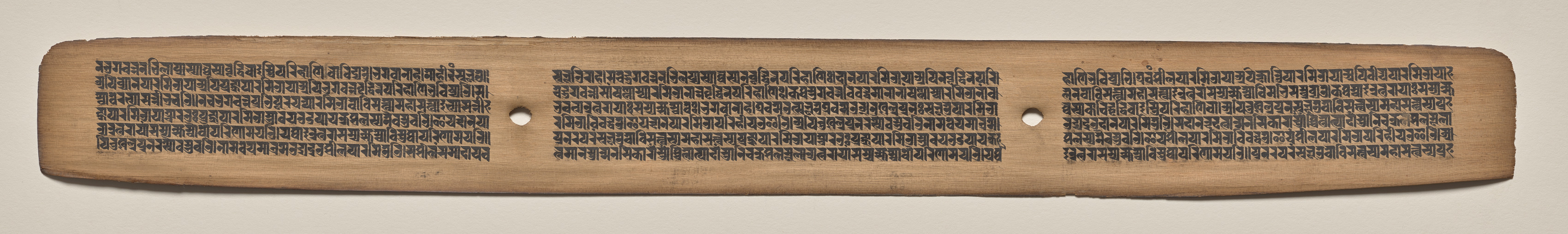Rectangular, light-brown, wooden manuscript page with rounded edges, featuring three sections of dark text written in a foreign script. Two circular holes are present, one in the center of each side, separating the sections. The text is arranged in horizontal lines, with approximately 12-15 lines of text per section. The background of the image is a light beige color.