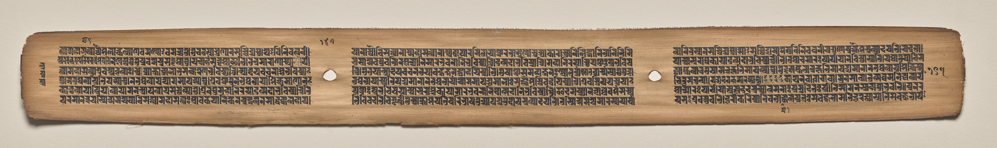 Pale yellow-brown, long, thin, rectangular piece of paper or parchment with uneven, rough edges. Three oblong holes, evenly spaced horizontally across the image. The surface contains dense rows of small, black text written in a non-Latin script, possibly in several columns. The text is arranged in a formal, uniform style with no images or illustrations. The background behind the paper or parchment is a solid, light beige color.