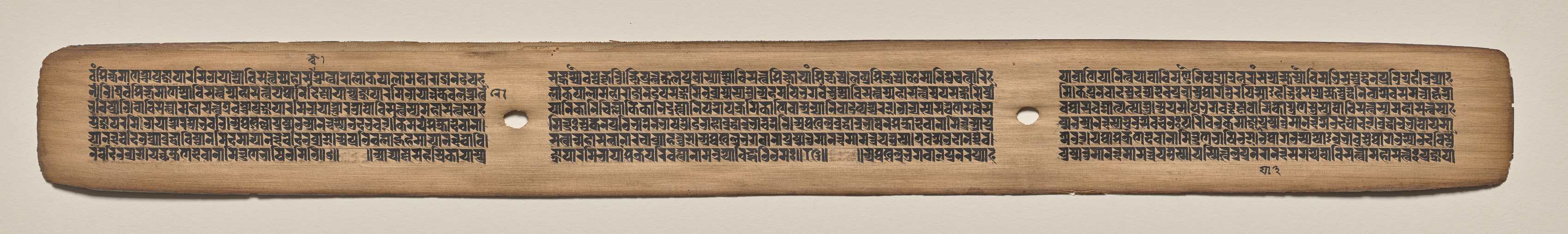 A long, thin piece of light-brown parchment with slightly rounded short ends. The parchment contains three columns of dark-brown text written in an ancient script. There are two small holes on either side of the center column. The columns are divided by the holes. The text fills the entire surface, with no visible images or illustrations. The background behind the parchment is beige.