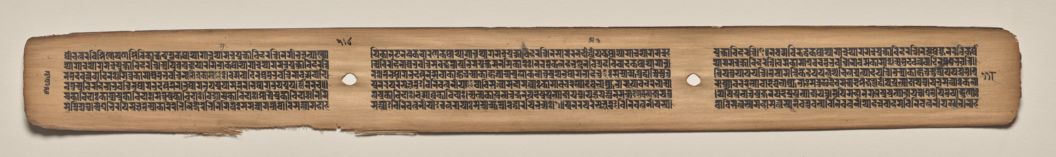 Long, narrow, aged, light brown parchment with rough edges; three columns of black text; two holes in center; background beige.