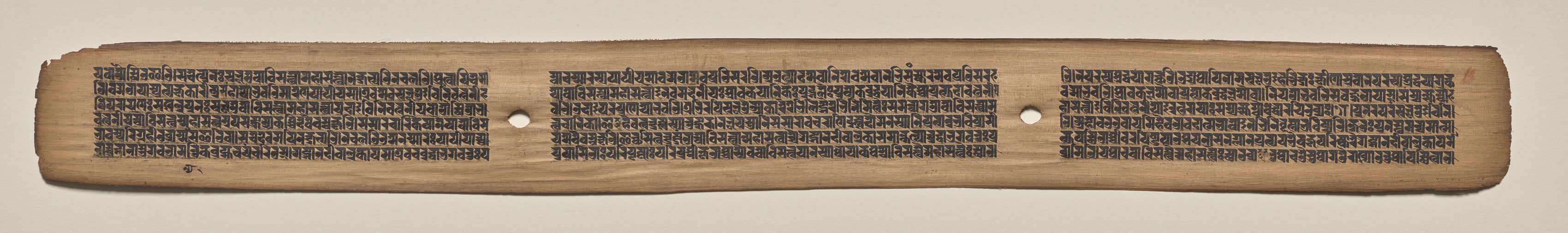Rectangular, light-brown piece of paper or parchment with uneven edges. Three sections of black text arranged horizontally. Two small circular holes, one in the middle section, the other to the right. Text organized in dense rows and columns. Background behind the paper is off-white.