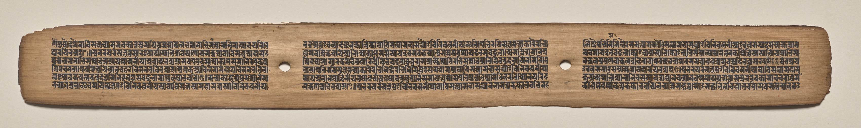Long, rectangular, aged parchment with rough edges and two small holes. The parchment has three columns of dense, small, dark writing. The writing is in a language that appears to be ancient. The parchment's color is light brown. The background behind the parchment is a solid, light beige color. The parchment is oriented horizontally. The writing columns are separated by two small holes. The holes are circular and roughly equidistant from the edges and each other. The parchment's surface appears worn and aged. The writing covers most of the parchment's surface. The image shows the front side of the parchment.