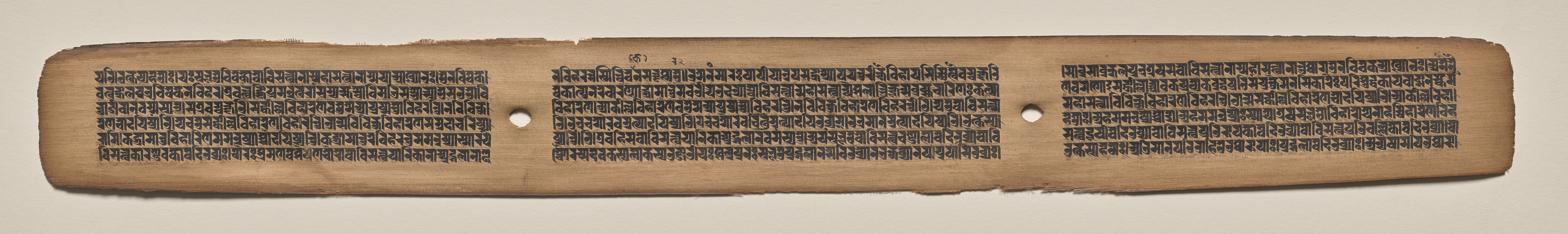 The image shows a long, narrow, aged piece of parchment with three sections of black text. The parchment is light brown and has rough, uneven edges. Two small holes are present, one in the middle left and one in the middle right. The text is written in a foreign language, possibly Sanskrit, and is arranged in lines that run horizontally across the parchment. The text is divided into three sections, each containing multiple lines. The background of the image is a plain beige color.