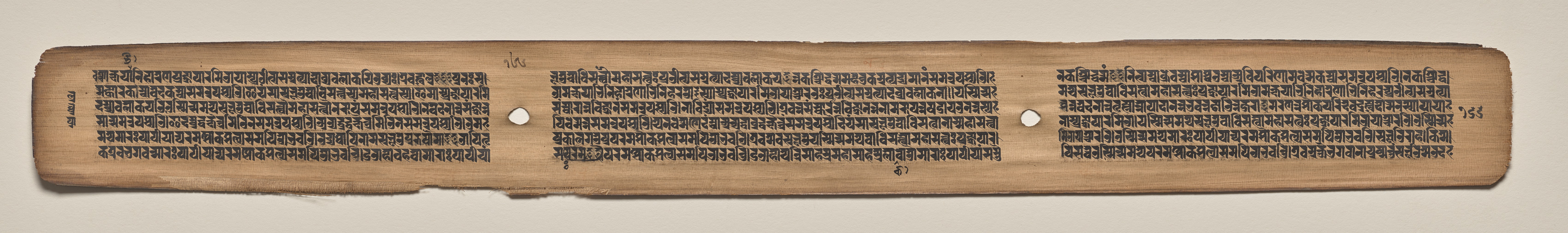 A long, narrow, light brown piece of parchment or paper with text written in black ink. The piece is rectangular with uneven edges and has two small holes in the center. The text is written in a foreign language, possibly Sanskrit, in rows that run horizontally across the page. There are three sections of text separated by the holes. The background of the image is a plain beige color.