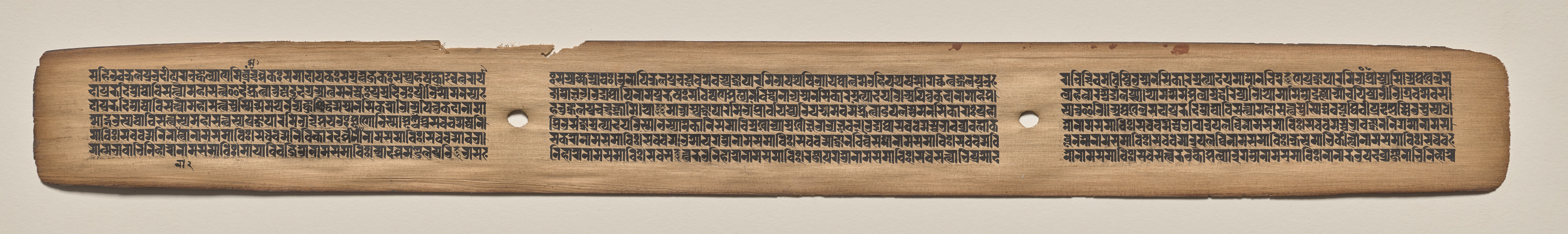Long, narrow, light brown rectangular piece of material with rounded edges, slightly darker around the edges. Three sections of black text, each section separated by a small circular hole. The left and right sections have text aligned to the left, the center section has text centered. The top edge has a jagged tear on the left side. The background is off-white.