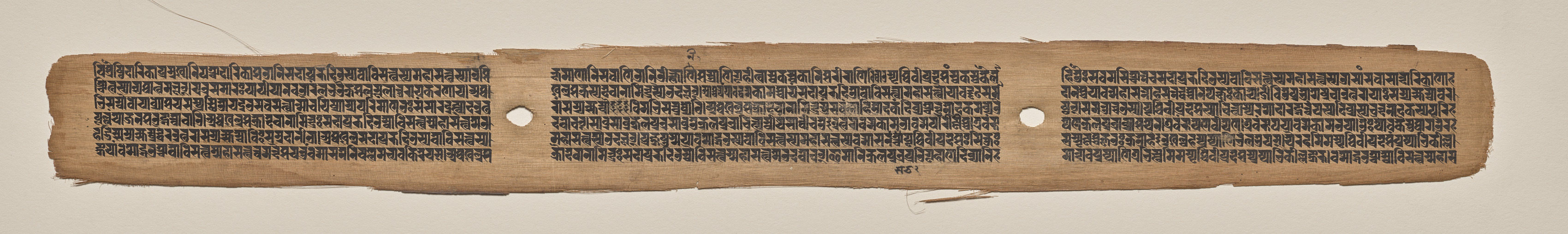 Rectangular piece of aged, light-brown paper with rough, uneven edges. The paper has three sections divided by two small circular holes. Each section contains several lines of small, black text written in a non-Latin script. The text is densely packed and appears to be written in a uniform style. The background behind the paper is a solid, light beige color.