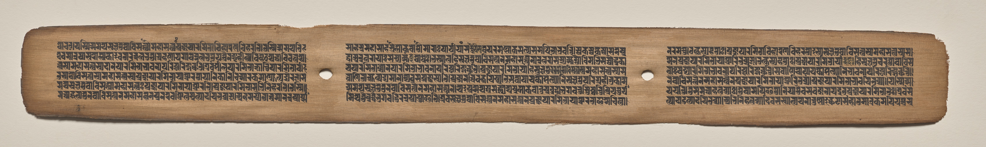 Long, narrow, light-brown colored page with uneven edges. Three columns of dark text written in a small, uniform script. Two small holes on the right side of the page. The page appears to be old and worn.