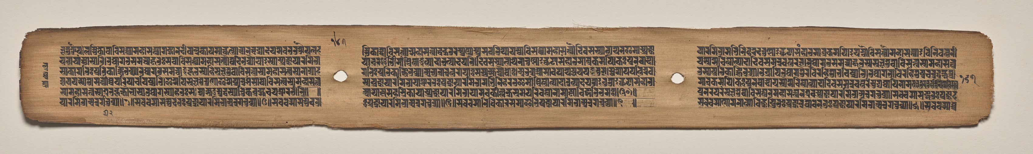 A long, narrow, yellowed piece of parchment with frayed edges; three sections divided by two round holes; black, written text; small, dense lines of text arranged in rows; background light gray. The artwork is by unknown artist and the title is "Text, folio 167 (verso), from a Manuscript of the Perfection of Wisdom in Eight Thousand Lines (Ashtasahasrika Prajnaparamita-sutra)".