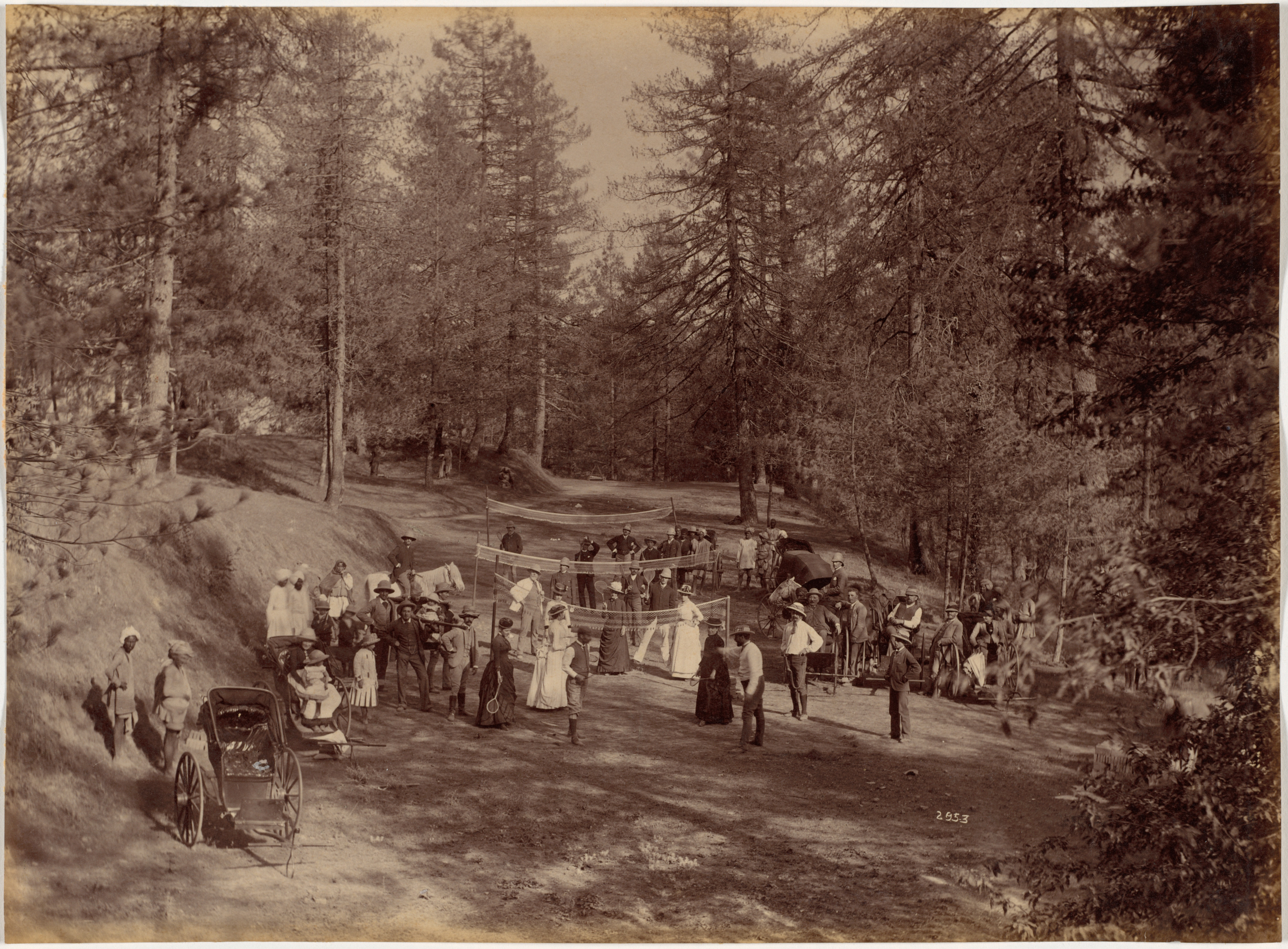 Sepia-toned photograph of a badminton game on a dirt road. The game takes place in a wooded area with tall trees on both sides of the road. A crowd of people, dressed in early 20th-century clothing, watches the game. A net stretches across the road. Two women in long dresses stand on either side of the net. People in the crowd wear hats, some men wear military uniforms. Two horse-drawn carriages are parked on the left side of the road. A hill rises on the left side of the road. The photograph is titled "Badminton Party at Mashobra, Shimla" and is attributed to Raja Deen Dayal.