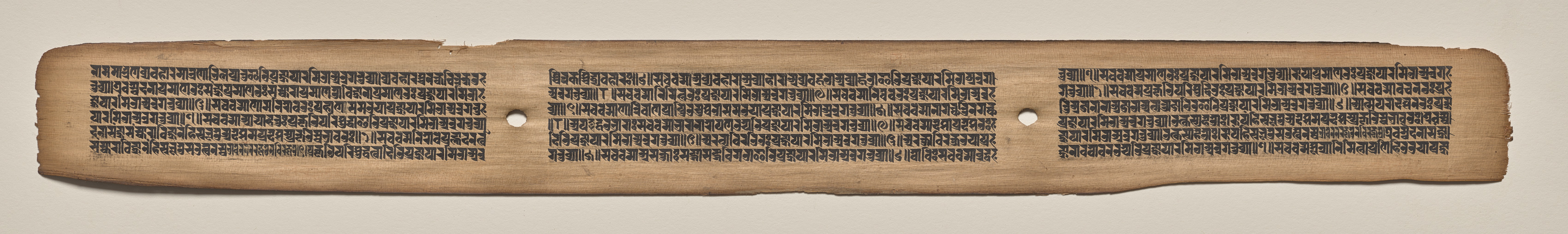 Long, narrow, aged parchment or paper with uneven edges and darkened areas around the edges. The parchment or paper is off-white with a light brown hue. Three columns of small, black text written in a language that appears to be an ancient script. Two small circular holes are present, one in the center of the left and right thirds of the parchment. The text is arranged in lines within each column. The background is a plain off-white color.