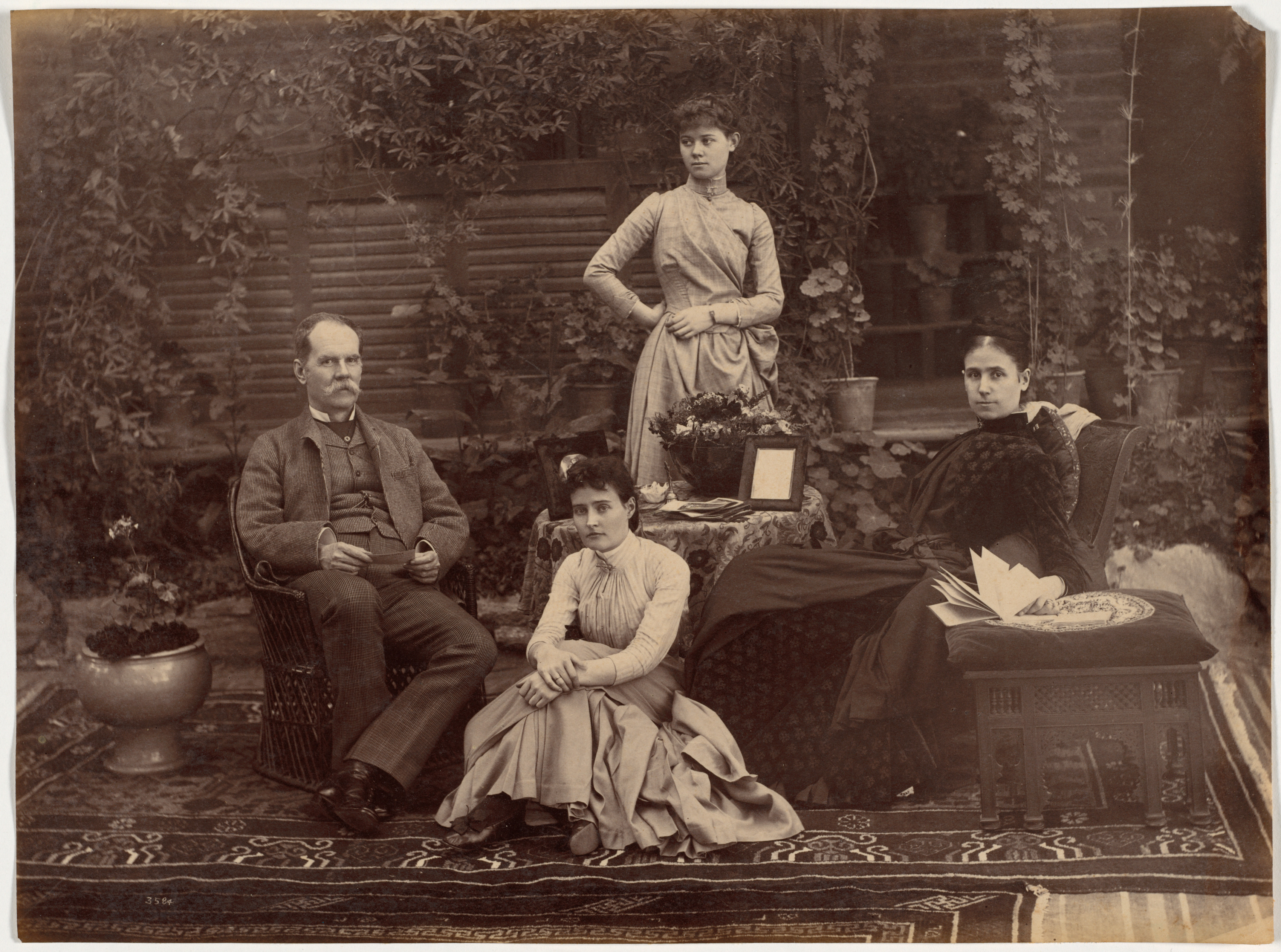 Black and white photograph of a family of four outdoors. The man on the left sits in a wicker chair wearing a suit with a vest, tie, white shirt and dark shoes. The woman on the right sits on a wicker chair wearing a dark dress with a high neckline and long sleeves. The woman in front sits on the floor wearing a long dress with a high neckline and long sleeves. The woman standing behind wears a long dress with a high neckline and long sleeves. They all face the camera. There are potted plants behind them and a table with a floral arrangement in front. The floor has a large rug with an intricate design.