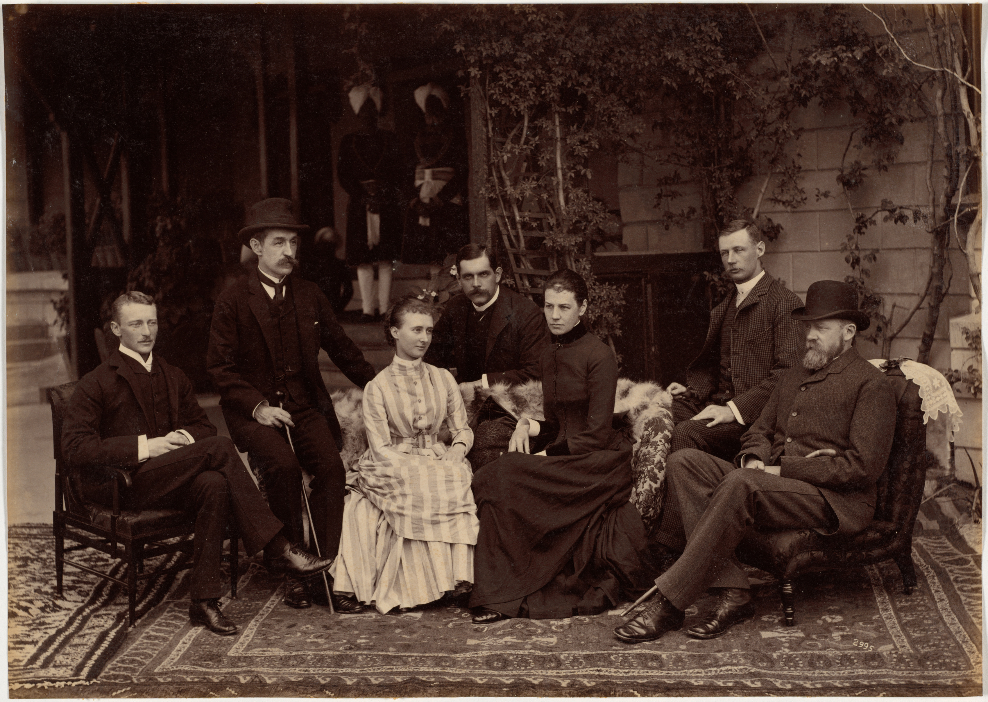 Black and white photograph of seven people sitting and standing on a rug. A light-skinned, dark-haired boy sits on a chair on the left. He wears a dark suit. Next to him on the left is a light-skinned man with a mustache and hat. He wears a dark suit and holds a cane. A light-skinned woman with blonde hair sits next to him. She wears a white and gray dress. A light-skinned man with dark hair stands behind her. A light-skinned woman sits next to the woman. She wears a long dark dress. A light-skinned man sits on the right. He wears a hat and dark suit. A light-skinned man with short dark hair stands behind him. He wears a plaid jacket. They sit on a patterned rug on a porch with trees and brick wall.